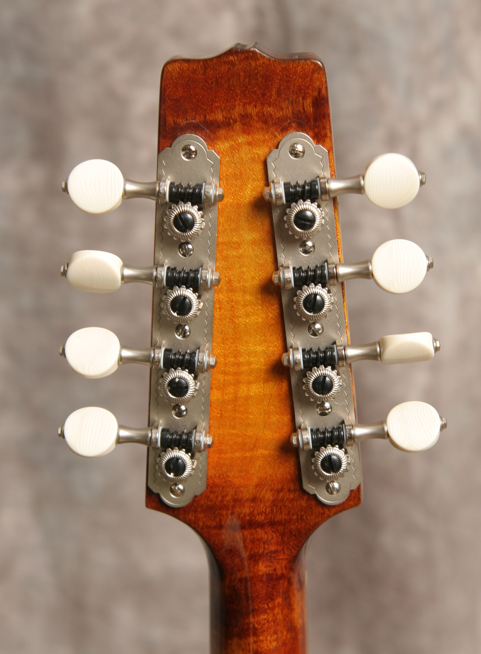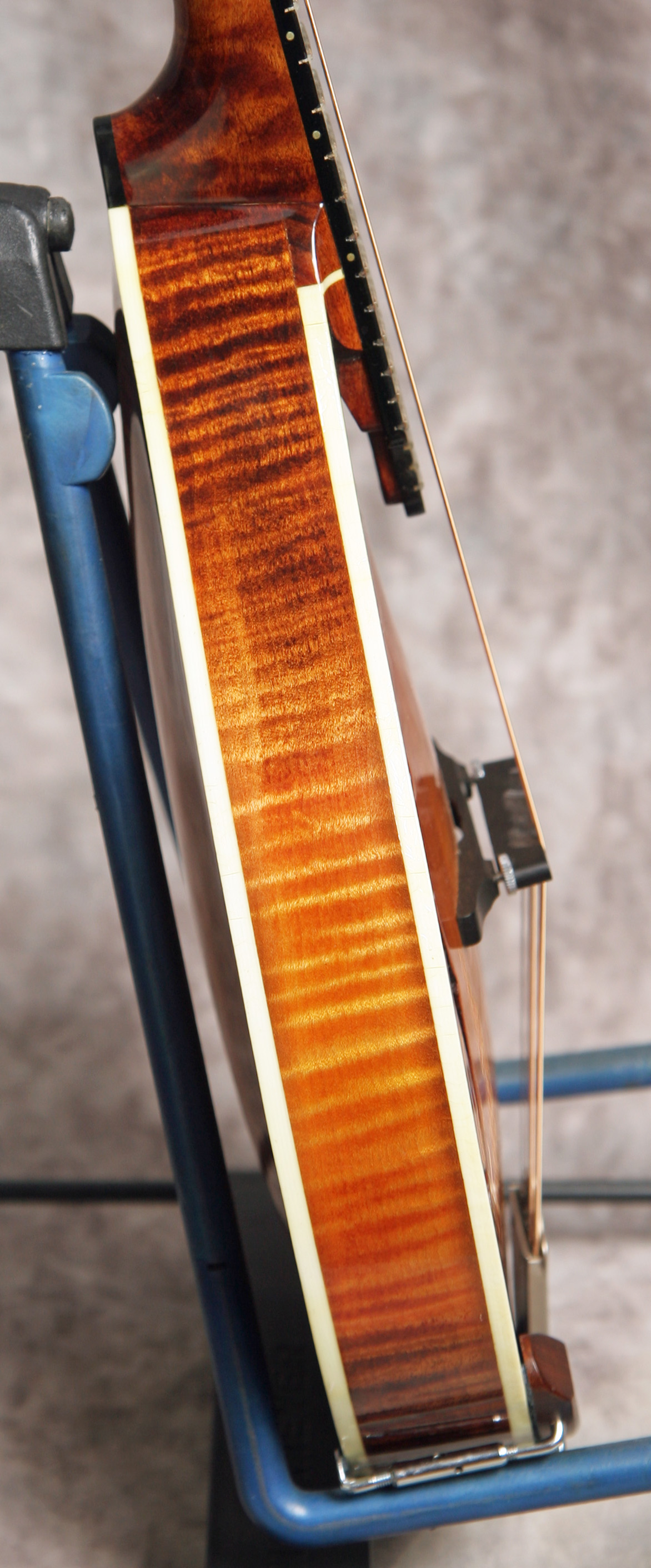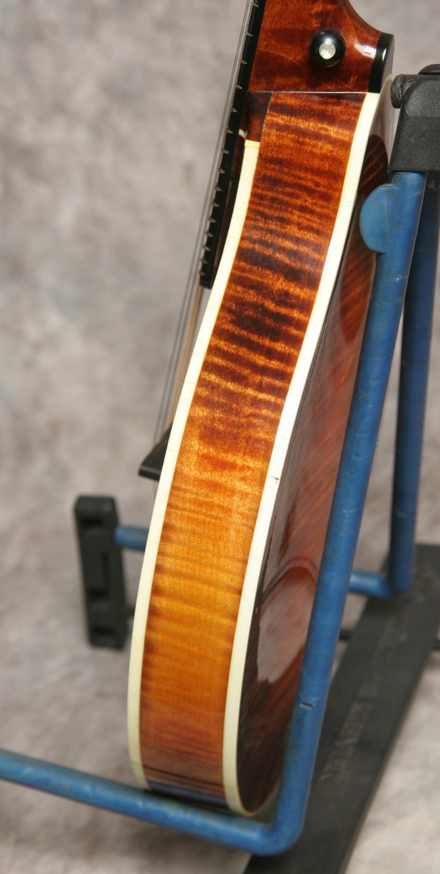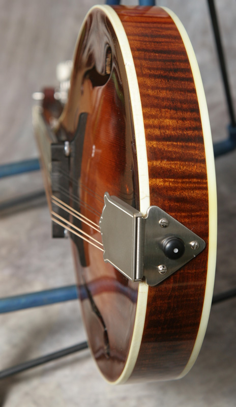 (Serial No. 841110435) Excellent condition, sunburst finish. Made just after Gibson accquired Flatiron, so many of the same builders and production techniques were carried over from the pre-Gibson days. When Gibson went to the NAMM show in late 1987, these were the high quality mandolins they were competing with. They couldn't beat them, so they bought the company. Excellent sounding and playing A5 mandolin with flamed maple back, sides and neck, carved spruce top with X bracing, pearl logo, 1 1/8 inch nut, elevated flat ebony fingerboard, and nickel hardware. Finish is original lacquer with a hand applied sunburst stain. Tuners are upgraded to Golden Age (no new holes) with a satin nickle finish, and the tailpiece has been changed to a silver plated James. McClung armrest added but is easily removed. Great playing mandolin that shows just a little playing wear. No repairs noted. The sound is why you want this mandolin. Excellent chop and bark - outstanding bluegrass mandolin. Signed by Steve Carlson, the shop foreman and considered one of the great builders. Bozeman built Flatirons are always heavily in demand. Most pickers won't part with theirs - once you play this one you'll know why. Comes with what I think is the original hardshell case.