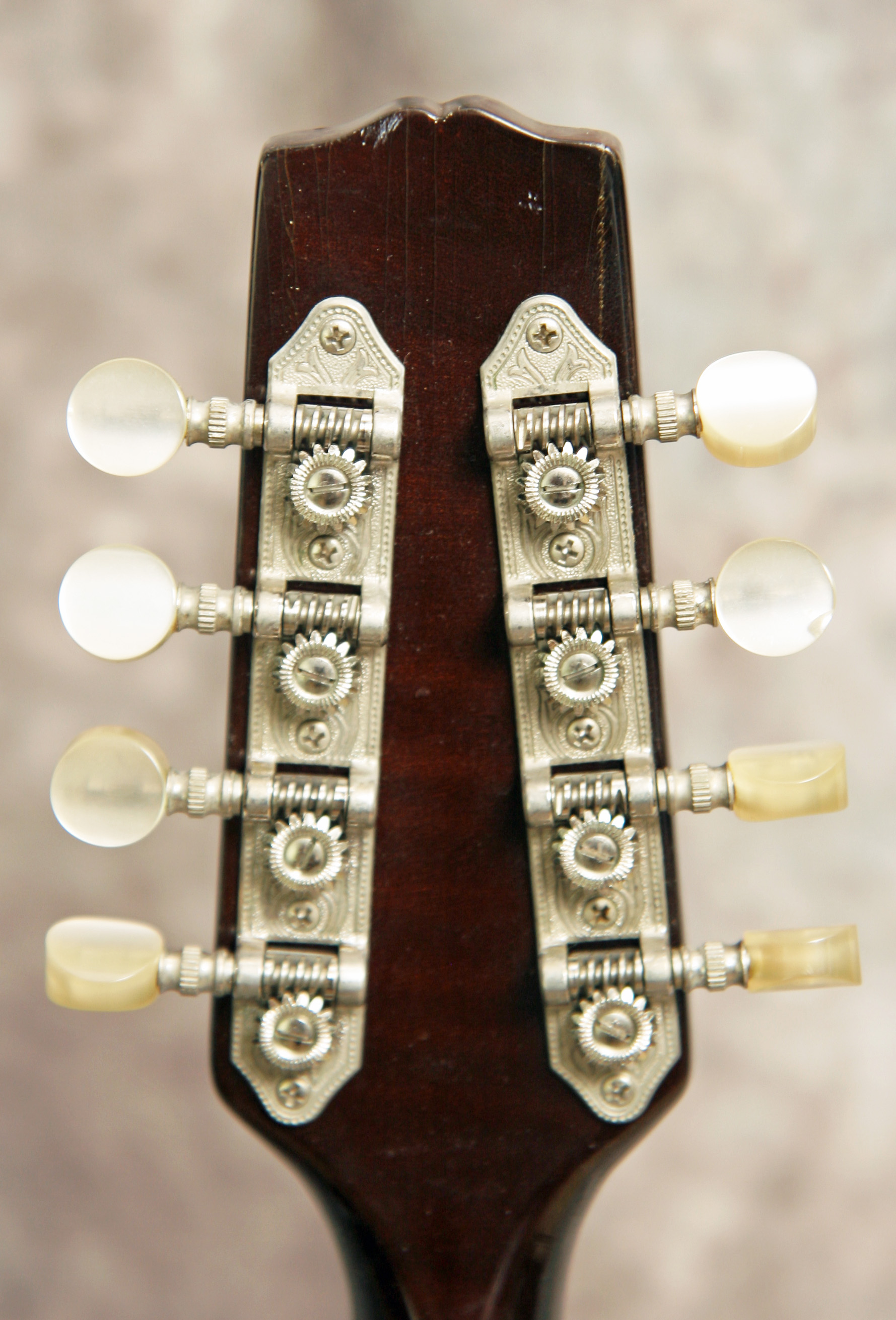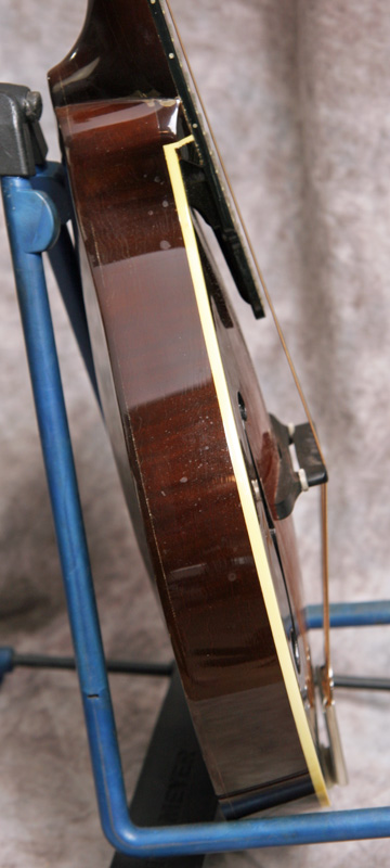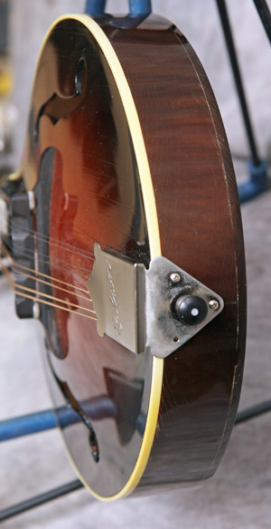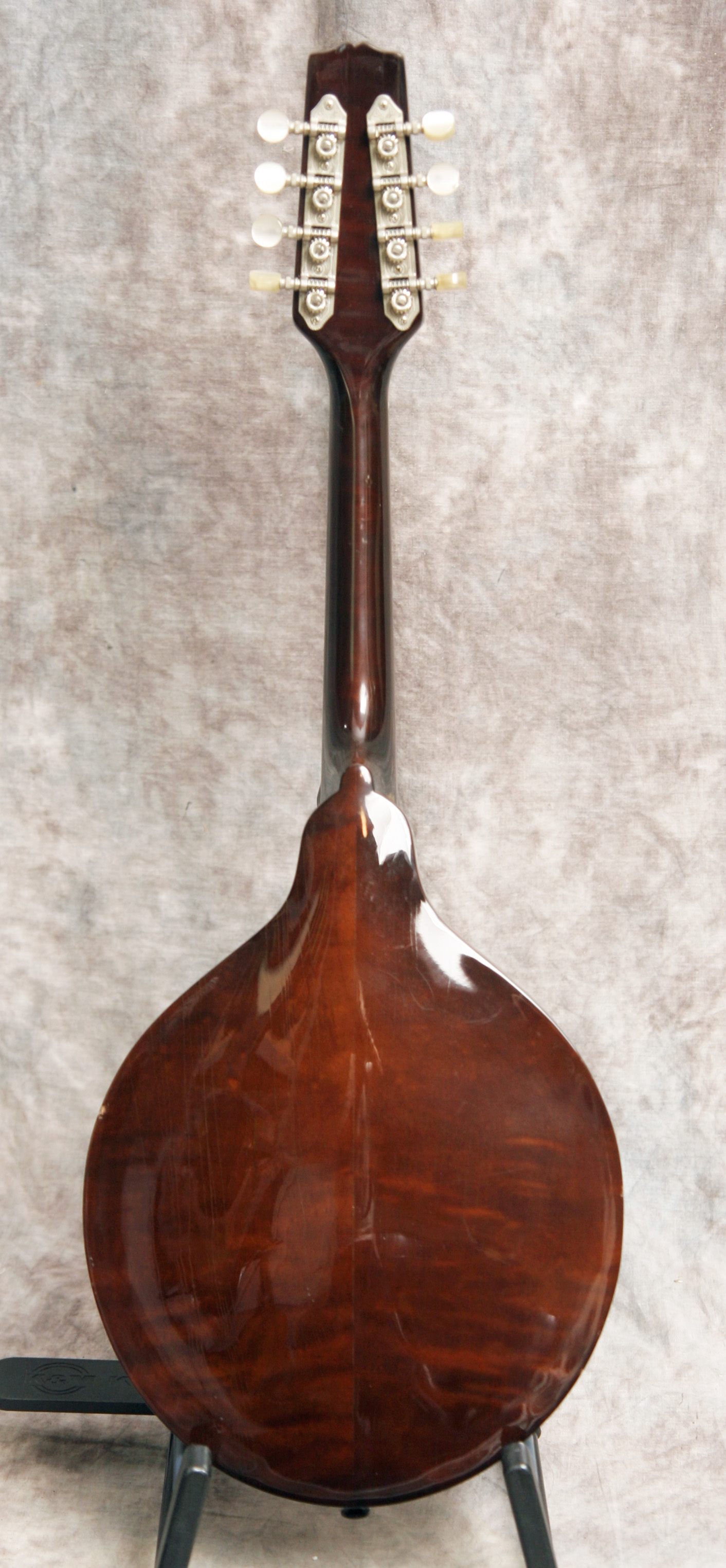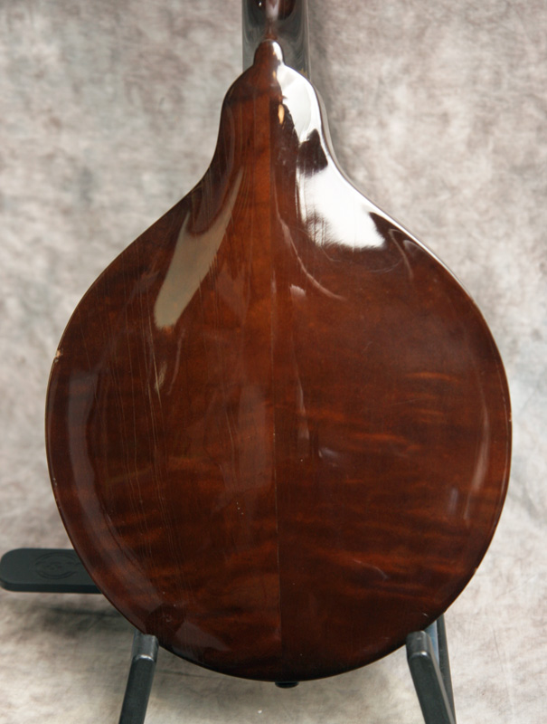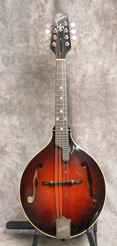 (Serial No. 5412019) Excellent condition, sunburst finish, signed January 30th, 1995 by Phil Brug in Bozeman, MT. Want the sound and playabilty of a Gibson F5 at a more affordable price? This is the classic Gibson mandolin in an "A" body style. It was built during the halcyon days of Steve Carlson and Bruce Weber. Nicely flamed red maple back, Sitka spruce top with tone bar bracing, V shaped neck profile, 1 1/16 nut and traditional dimension fret wire. This instrument is feather light and delivers super responsive ringing bell tones and a strong bass that allows both the lightest single note picking or hard driving woody bluegrass chop. Distinctly Gibson in tone and playability. Click here for a video clip of this mandolin. There is very light pick wear on the top, minor finish checking, and some light marking on the back allowing for excellent condition. If you are looking for classic Gibson neck shape and ringing, dry, woody tone, this is your mandolin. Comes with the original shaped hardshell case.