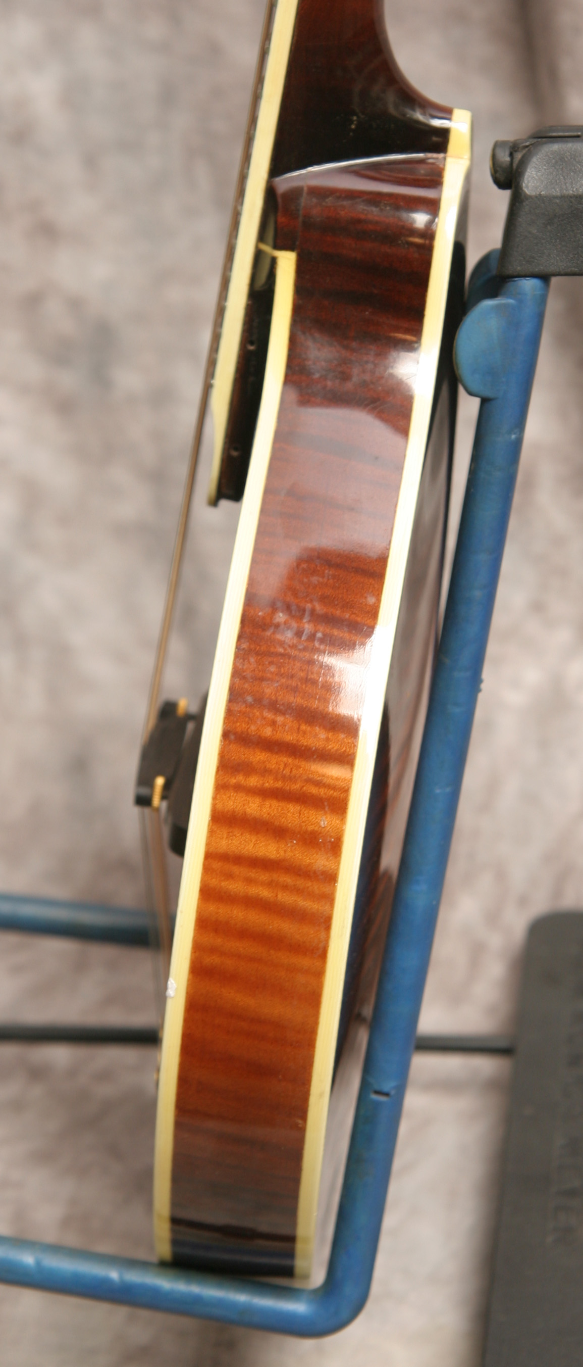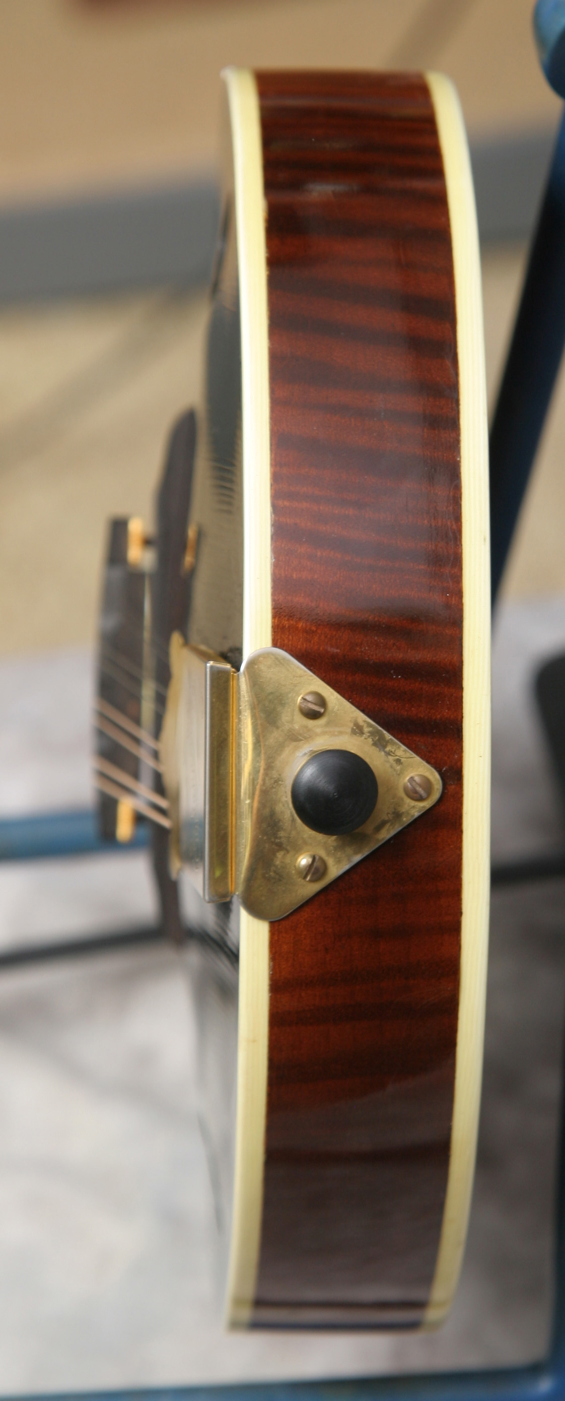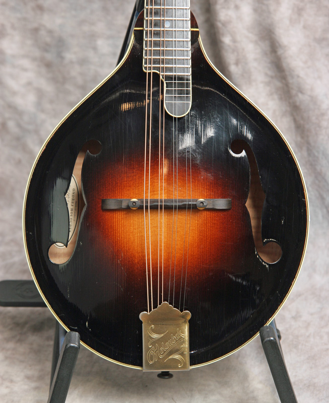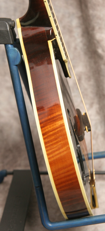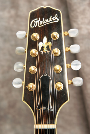 (Serial No. 060T) Excellent condition, dark red brown sunburst finish. This instrument was built by the Czech luthier Ondrej Holoubek. This is an A style with a hand-carved red spruce top, figured solid maple maple back and sides, 1 1/8 inch pearl nut, and a radiused and bound ebony fretboard. The fretboard has been scooped to eliminate pick click and to allow you to play in the sweet spot. Has an ebony bridge. The peghead has a pearl logo, gold Schaller tuners and a engraved gold plated tailpiece. Just set up by luthier Marty Beeson so it plays very well. Here is a short video clip click here of this mandolin played by Joe Donahue. Excellent sounding mandolin with strong volume and tone. Good bluegrass chop when needed. Comes with the original hardshell case.