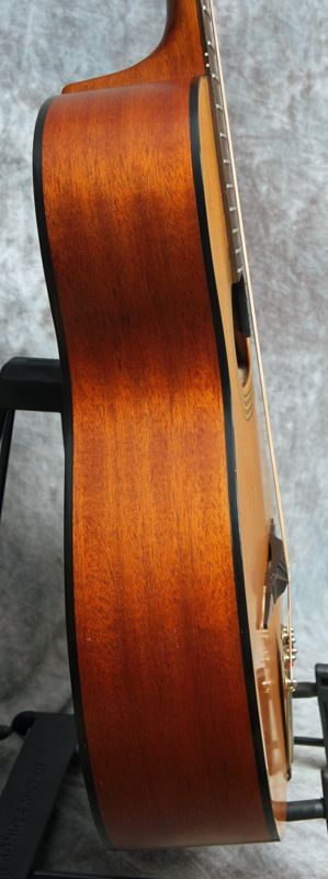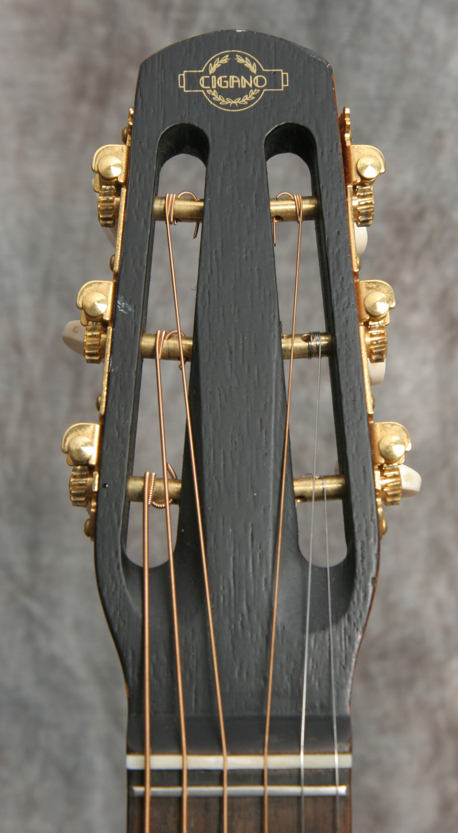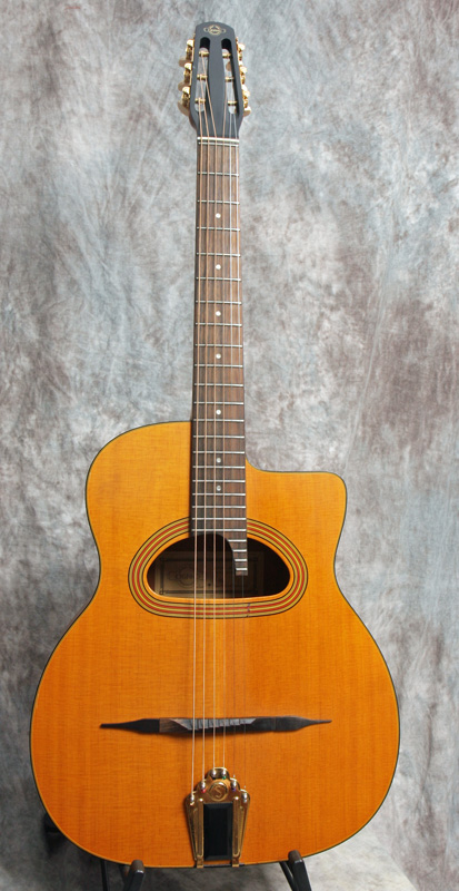 (Serial No. 11010155) Excellent condition - looks unplayed. Very clean guitar. I've alway been facimated by gypsy jazz guitars, so I bought one. This is called a Grand Bouche as it has the large soundhole, which gives that deep Gypsy sound. . From the Saga website: From the complicated playing techniques, to the limited availability of truly affordable instruments necessary to capture that proper Gypsy tone, the obstacles to learning how to play Gypsy Jazz music can easily discourage the seasoned guitarist, let alone a beginner. To make it even easier to begin this exciting musical journey, Saga Musical Instruments and Gitane guitars introduce the new GJ-15 Cigano Student Gypsy Jazz guitar! Its short-scale, D-hole design gives it that characteristic deep bass response and incredible volume making it the perfect rhythm instrument. Value, tone, playability and workmanship will meet or exceed any players expectations. The guitar has solid ribbon mahogany back and sides, with a solid Sitka spruce top with traditional large D-shaped soundhole. Neck is a slim profile. Rosewood fretboard and bridge. The traditional brass tailpiece and rosewood compensated mustache bridge is perfect for the Django Reinhardt enthusiast. Good neck set, neck is straight, frets are fine. Comes with a really nice foam hard case.